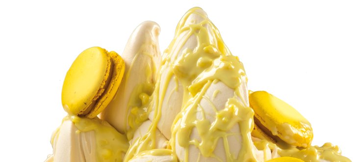 Una pasta alla mandorla biscottata che richiama il gusto del classico macaron, arricchita da variegato al limone dal colore vivace e da croccanti pezzi di macaron, per un raffinato gioco di consistenze.